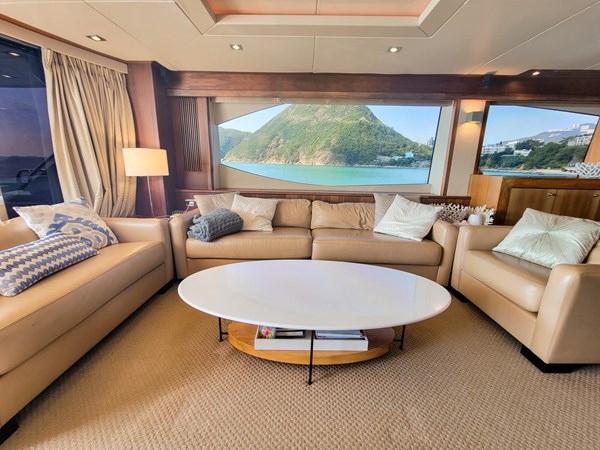 The interior is fitted in dark oak joinery giving it that glamorous, classic British look and feel. There are plenty of sofas inside the saloon and a big 8-person dining table on the stbd side of the saloon for guests to enjoy many enjoyable meals at sea.
