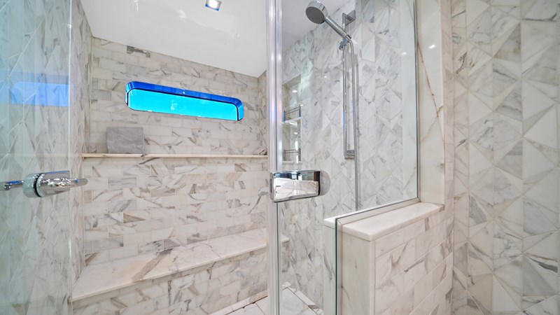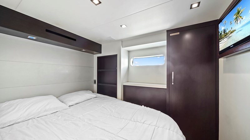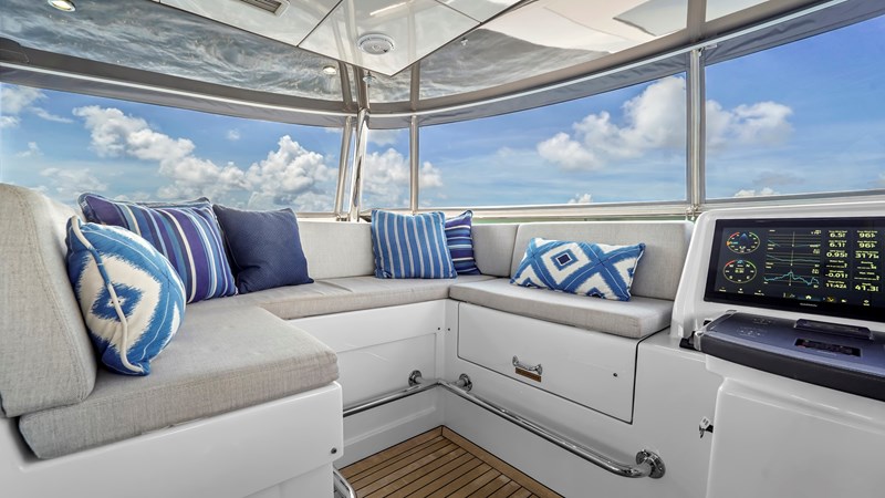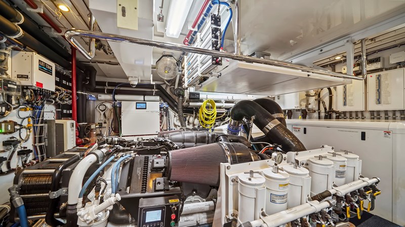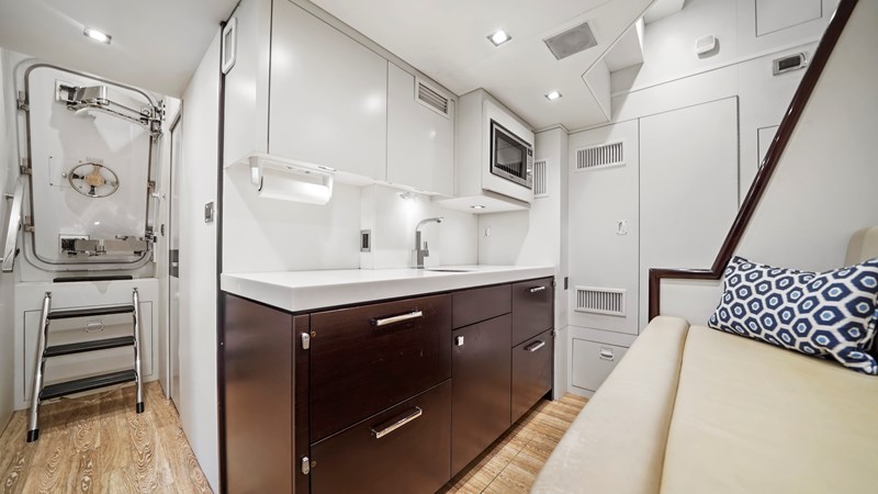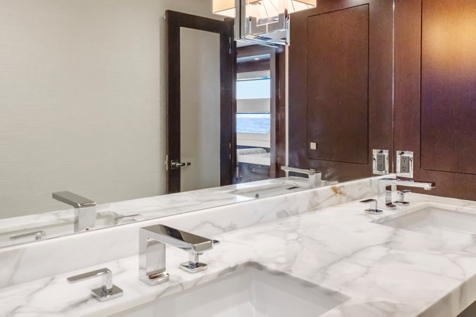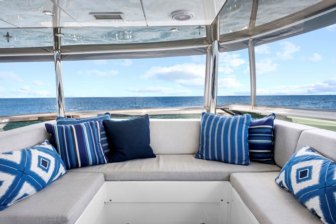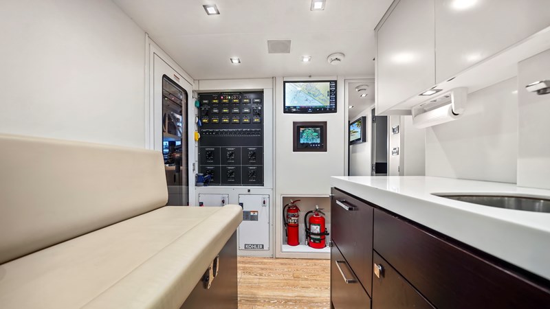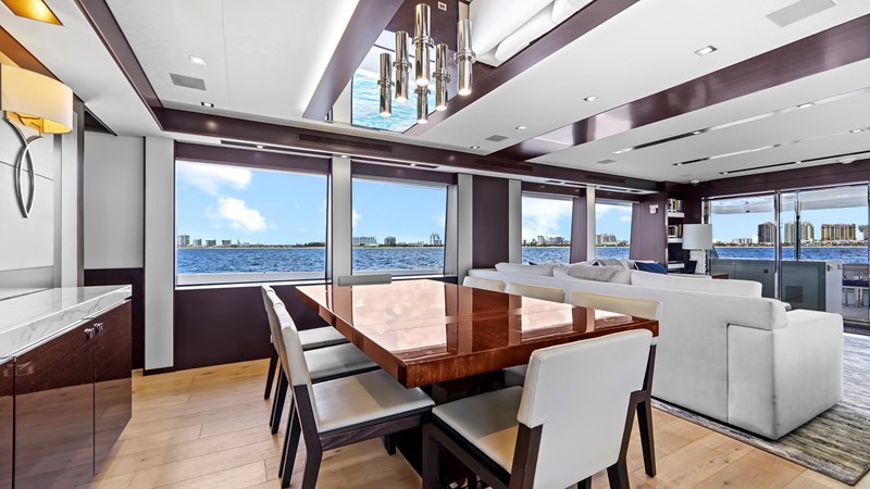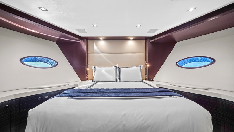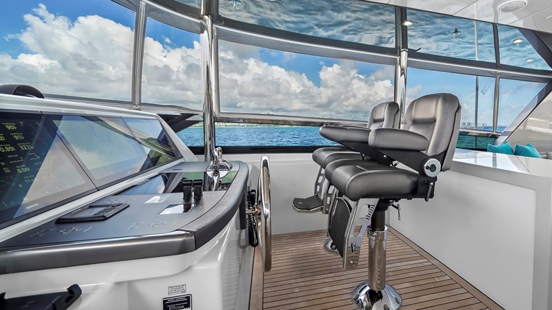 The port side salon opens to a custom balcony with triple sliding glass doors, creating a seamless connection between indoor and outdoor spaces. Other standout features include dual water makers, zero speed fin stabilization, and hydraulic bow and stern thrusters. iPad controls manage lighting, entertainment, and electric blinds, enhancing comfort and convenience.