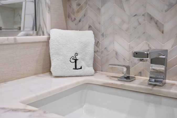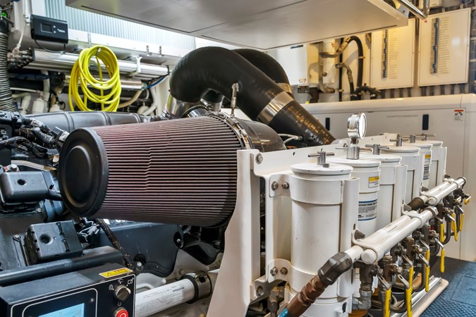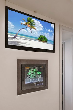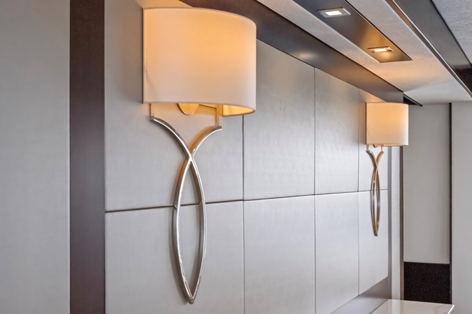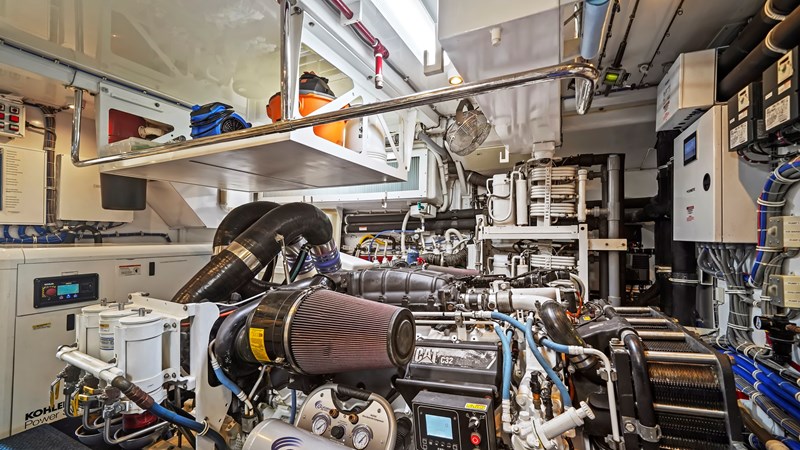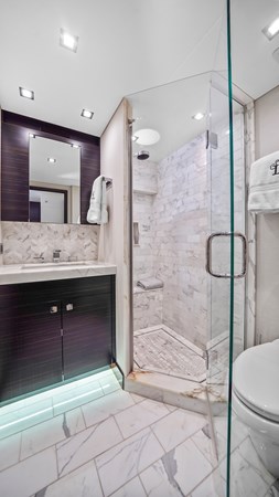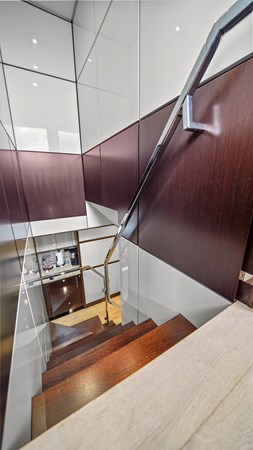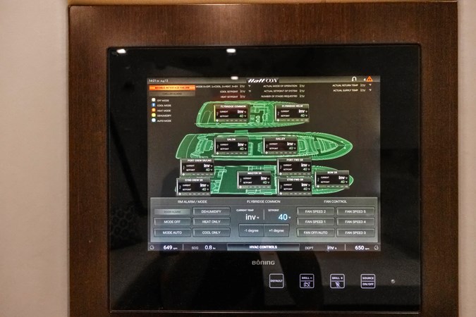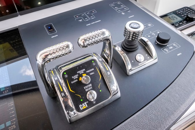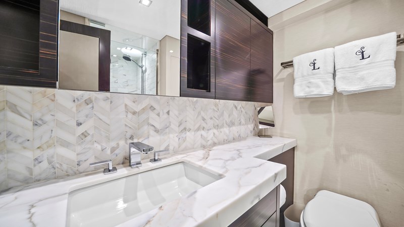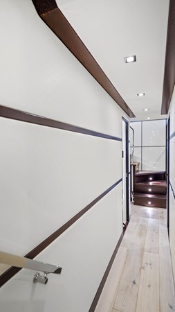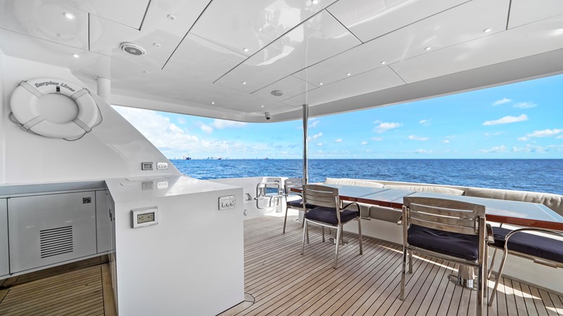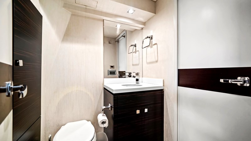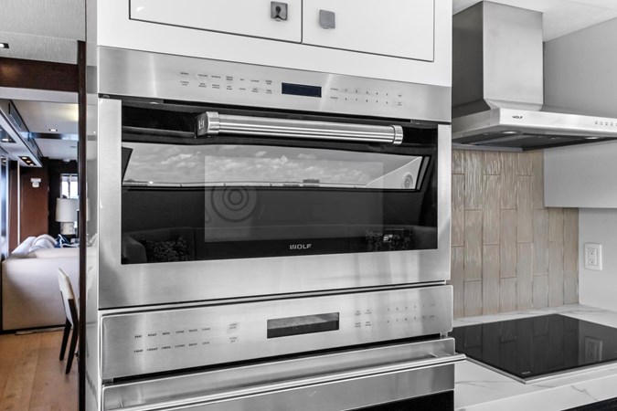 The port side salon opens to a custom balcony with triple sliding glass doors, creating a seamless connection between indoor and outdoor spaces. Other standout features include dual water makers, zero speed fin stabilization, and hydraulic bow and stern thrusters. iPad controls manage lighting, entertainment, and electric blinds, enhancing comfort and convenience.