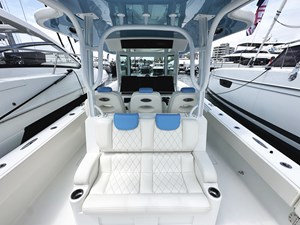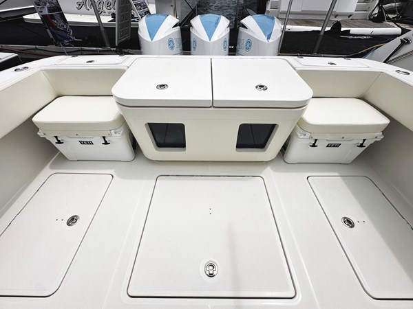 The aft cockpit includes two 40 gallon pressurized livewells, tackle and storage compartments, rod holders, and cushioned seating for two.