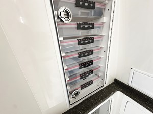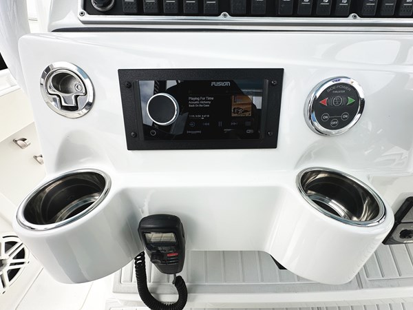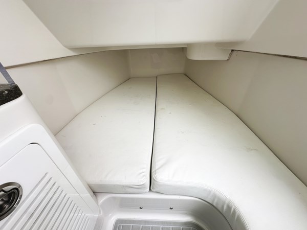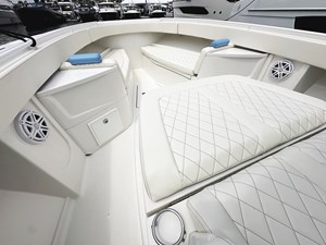 Powered by Triple Yamaha F35’s, TRIPLE J is rated at a top speed of 58mph @6000 RPM’s. The huge helm accommodates a 16” and two 12” Garmin MFD’s, Fusion stereo system, bow thruster, cup holders and a full instrumentation panel. With room for three at the helm, you’ll keep dry and protected under the extra-large hardtop and curved windshield. The contoured seating throughout will help to keep you from sliding when the Speciale accelerates or turn on a dime. The forward area features multiple chaise lounges and in the aft cockpit another lounge behind the helm seats can accommodate up to three. Below you’ll find a double berth, sink, storage, and a private head.