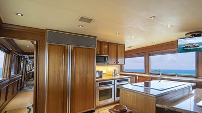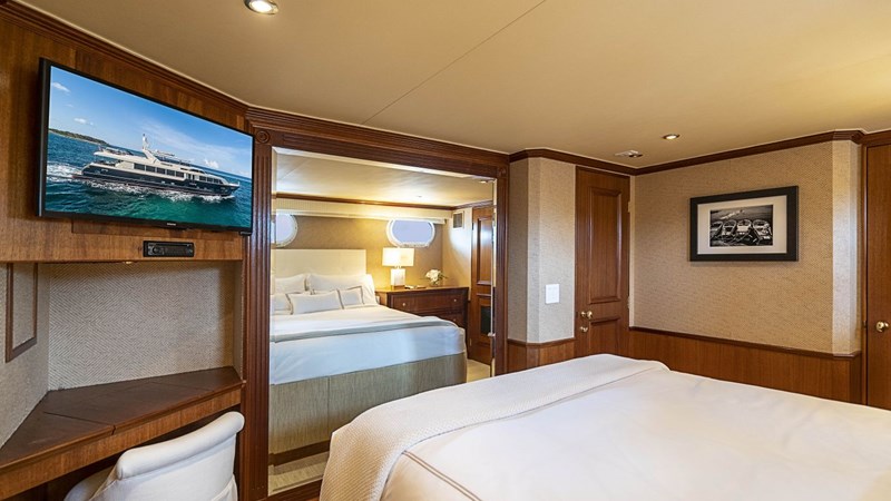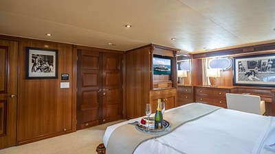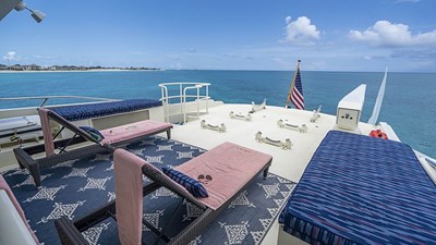 The main salon is light and airy with large pictures windows to provide guests with excellent views of the surround area. An elegant plush sectional with coffee table, games table and a wet bar make the main salon perfect for watching movies, casual entertaining, or formal events. A separate formal dining area is located forward which gives guest an intimate dining experience. The main deck aft provides comfortable outdoor seating.