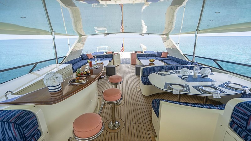 The ample and extensive flybridge provides a great social atmosphere complete with al fresco dining and a wet bar. For a more private area to relax there is a seating area on the foredeck.