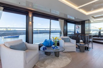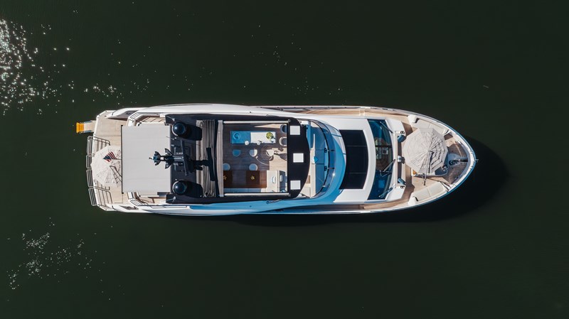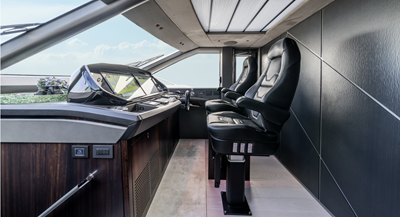 At the stern, a 20’ x 13’ Beach Club features a BBQ station, oversized rain shower, X-TEND™ sunbeds, hydraulic swim platform, Bezenzoni gangway, and dedicated lockers for water toys. The flybridge is among the largest in class, with an infinity spa Jacuzzi, wet bar, BBQ grill, twin dining tables, and a carbon fiber hardtop with retractable canopy.