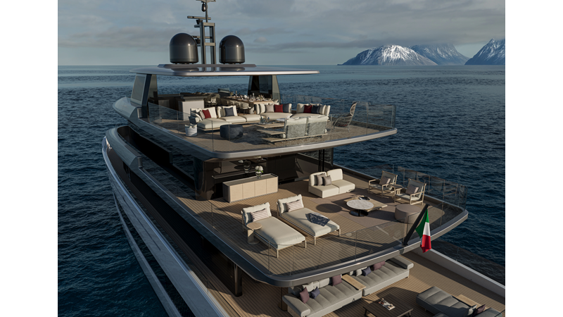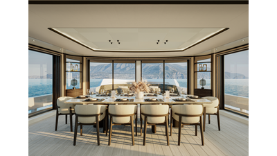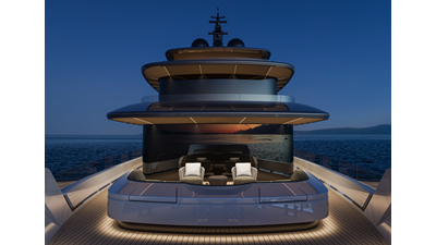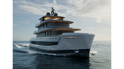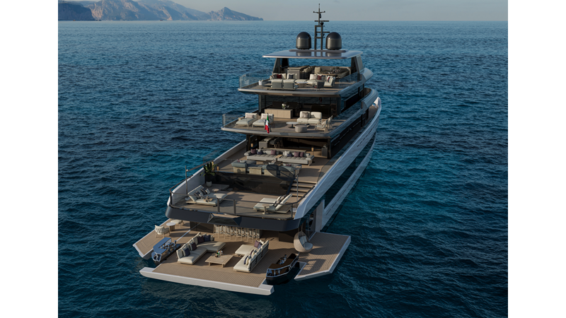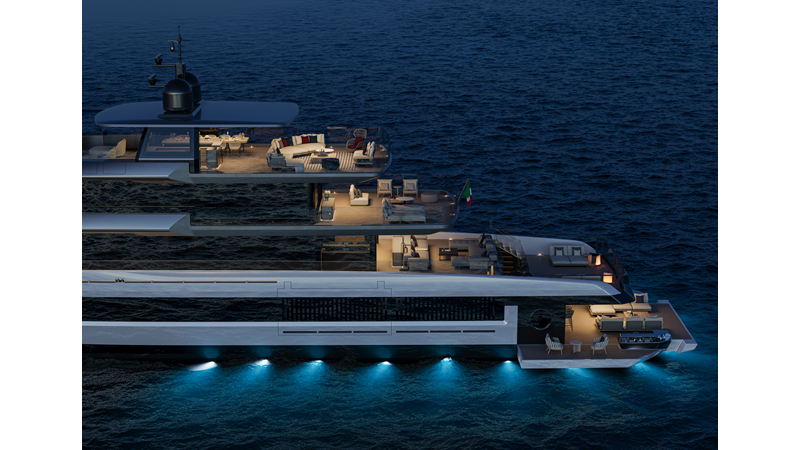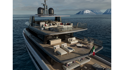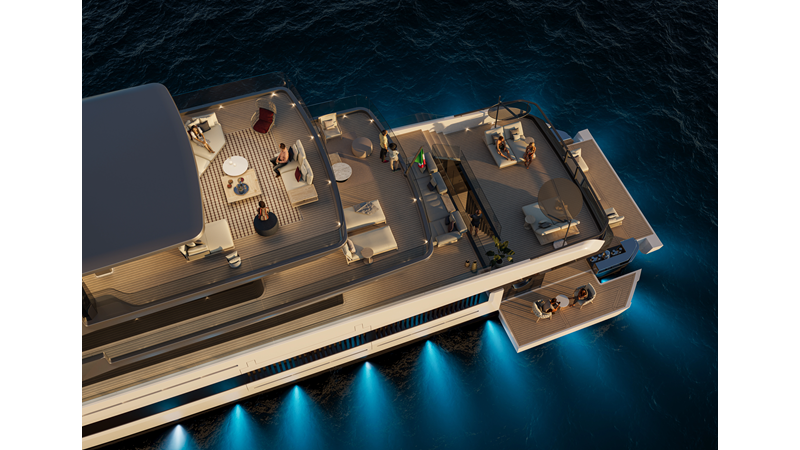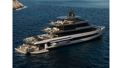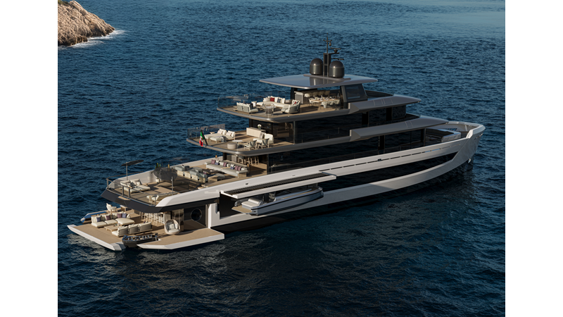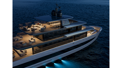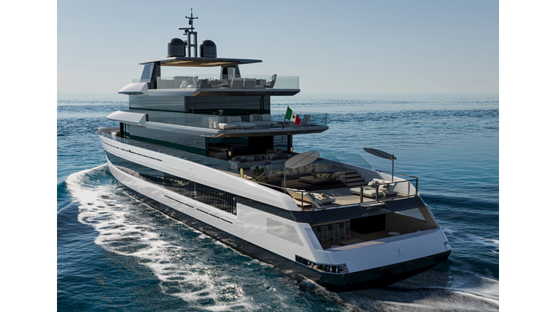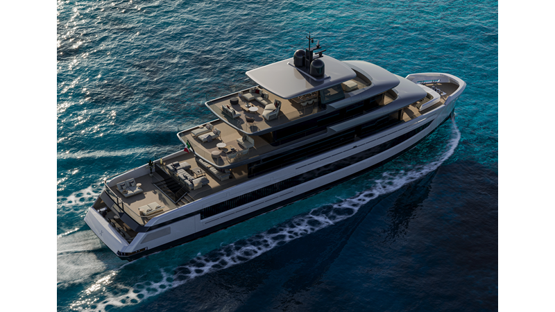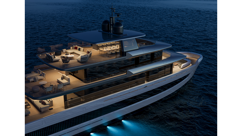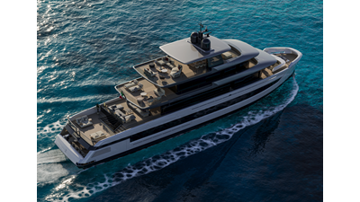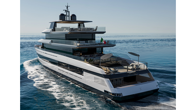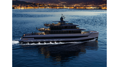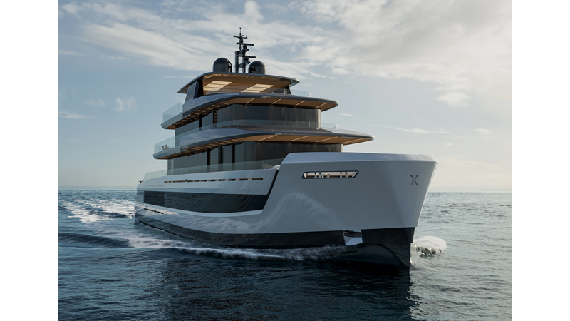 A 44-meter steel and aluminum yacht featuring a dual-mode hull and a 4,000-nautical-mile range. Exterior styling by Studio Agon, with generous volumes that ensure the comfort of next-generation explorer yachts.