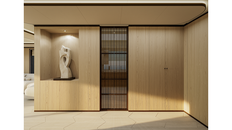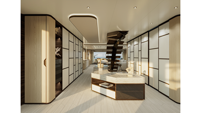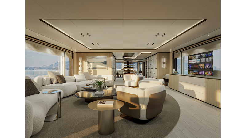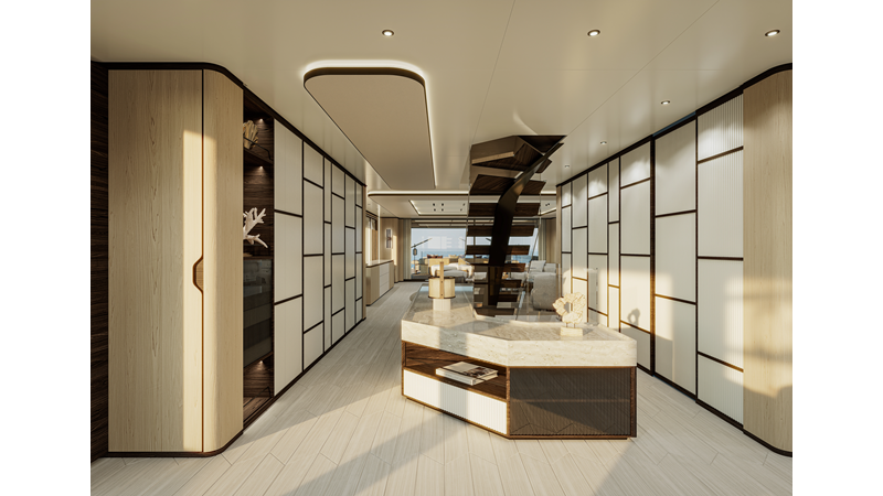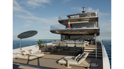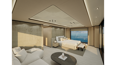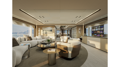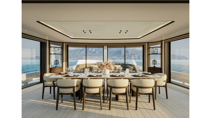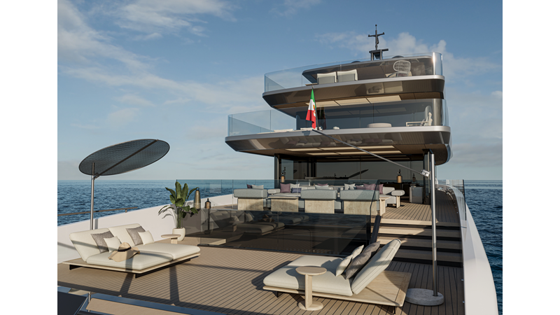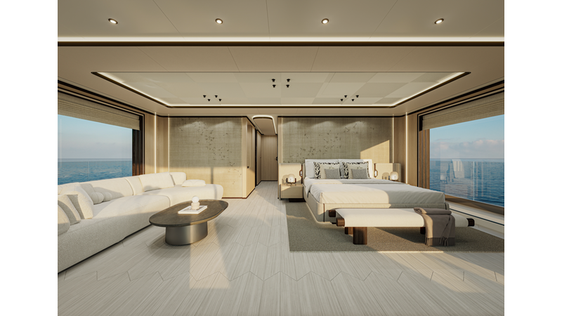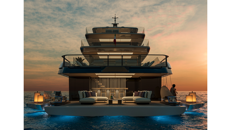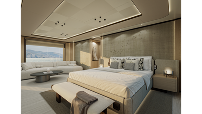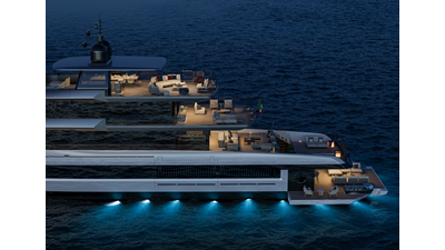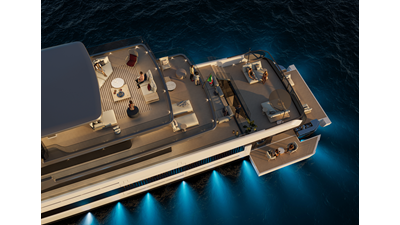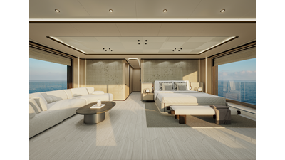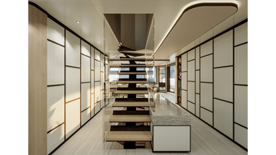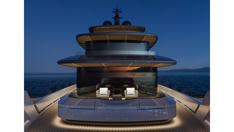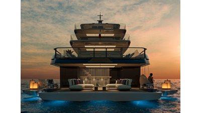 A 44-meter steel and aluminum yacht featuring a dual-mode hull and a 4,000-nautical-mile range. Exterior styling by Studio Agon, with generous volumes that ensure the comfort of next-generation explorer yachts.