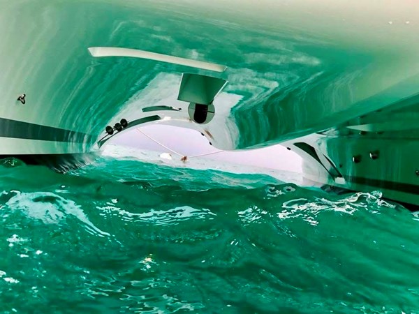 a large glazed door that occupies the entire width of the coachroof, and provides access to the unparalleled internal volumes.